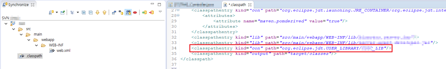 svn 버전 보다가 synchronize 하는 과정에서 .classpath 파일을 update 해보니 동일 증상이 발생.