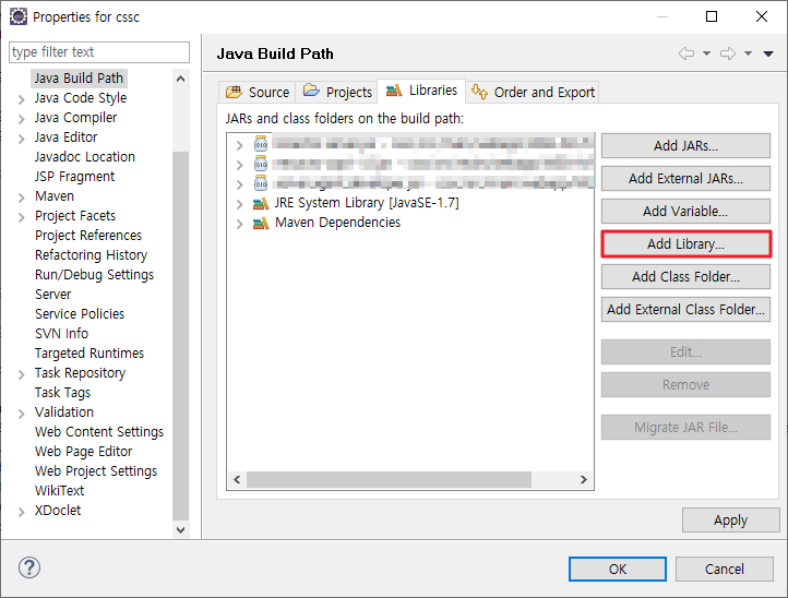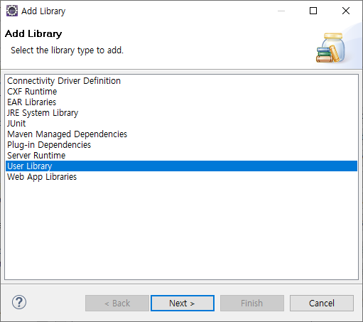 > Add JARs ... ( 이것을 통해서 각 라이브러리들을 담은 다음 ) > OK